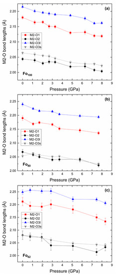 M2–O bond distance versus pressure for samples (a) Fo100, (b) Fo80, and (c) Fo62. Symbols: red squares, M2O1; black circle, M2O2; blue upward triangle, M2–O3l; grey downward triangle, M2–O3s. Lines connect points over the investigated pressure range for a particular bond distance and only serve as guides.