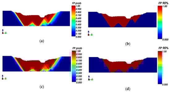 S-N sections, E views for probability models (FP prob) and a specific probabilistic ultimate pit limit for 90% reliability (FP 90%). (a) Scheme 2—probability final pit; (b) Scheme 2—90% probability final pit; (c) Scheme 3—probability final pit; (d) Scheme 3—90% probability final pit; (e) Scheme 4—probability final pit; (f) Scheme 4—90% probability final pit.