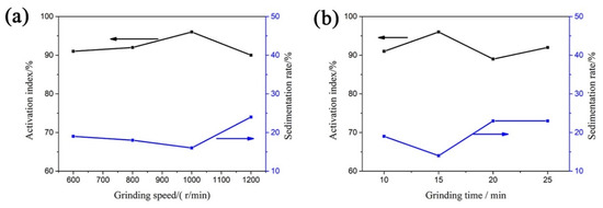 Influences of the grinding speed (a) and grinding time (b) on the activation index and sedimentation rate of CaCO3-TiO2.