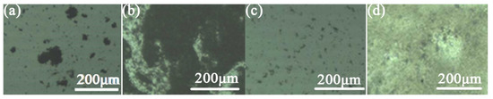 Figure 5 shows the images of unmodified CaCO3-TiO2 and modified CaCO3-TiO2 dispersed in ethanol (organic polar solvent) and kerosene (organic non-polar solvent). Unmodified CaCO3-TiO2 existed in the form of large-scale aggregates in ethanol and kerosene and the distribution of CaCO3-TiO2 was uneven (Figure 5a,b). The sizes of the aggregates in ethanol and kerosene were, respectively, larger than 100 μm and 200 μm, indicating the poor dispersion effect. As for the modified CaCO3-TiO2, although there were still some aggregates in ethanol and kerosene, the size of the aggregates significantly decreased below 10 μm (Figure 5c,d). The distribution of particles was more uniform, indicating that the dispersion of modified CaCO3-TiO2 in organic media was significantly improved. Undoubtedly, modification is an important factor for the improvement in the performance of CaCO3-TiO2. The result is consistent with Table 2.