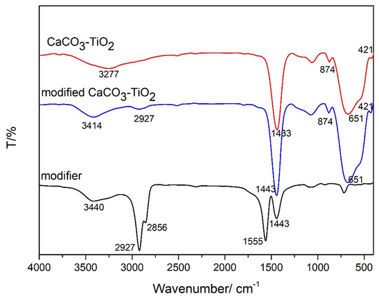 To investigate the binding properties between the modifier and CaCO3-TiO2, the infrared spectra of unmodified CaCO3-TiO2, modified CaCO3-TiO2, and SS were analyzed (Figure 7). In the infrared spectra of CaCO3-TiO2, the absorption band at 3277 cm−1 is ascribed to the stretching vibration absorption band of hydroxyl groups, indicating that several hydroxyl groups or a small amount of coordination water molecules are adsorbed on the particle surface. The broadness of the peak indicates the existence of the association between hydroxyl groups. This is undoubtedly the consequence of the dehydroxylation between CaCO3 and TiO2 and the hydration of TiO2 in CaCO3-TiO2. The absorption bands at 1433 cm−1 and 874 cm−1 can be assigned to the asymmetric stretching vibration and bending vibration of CO32− [27]. The broad band around 651 cm-1 is ascribed to the stretching vibrations of Ti–O bonds and the peak at 421 cm−1 is ascribed to the Ti–O–Ti bonds. In the infrared spectra of the modified CaCO3-TiO2, the characteristic absorption bands of –OH groups at 3414 cm−1 are different from those of CaCO3-TiO2 and the modifier SS due to the reaction between the hydroxyl groups of CaCO3-TiO2 and modifier SS. In addition to the characteristic bands of CaCO3 and TiO2, the observed characteristic band of SS at 2927 cm−1 is the characteristic peak of H–C–H asymmetric stretching vibrations. Therefore, it can be deduced that SS was adsorbed on the surface of CaCO3-TiO2. The characteristic peaks of COO− at 1555 and 1443 cm−1 in the spectrum of SS might shift and coincide with the peak of CO32− in the spectrum of modified CaCO3-TiO2 [28]. The above analysis indicates that the modifier is most likely to be chemisorbed on the surface of particles through the reaction of hydroxyl groups.