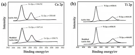 Figure 8 shows the XPS spectra of unmodified CaCO3-TiO2 and modified CaCO3-TiO2 as well as the changes in the binding energy of Ca and Ti. In Figure 8a, the peaks appeared at 346.92 eV and 350.48 eV in the XPS spectrum of unmodified CaCO3-TiO2 and correspond to Ca2p3/2 and Ca2p1/2. It can be seen that there is no significant displacement of Ca in the binding energy after the modification of CaCO3-TiO2. In Figure 8b, the peaks at 458.41 eV and 464.10 eV in the XPS spectra of unmodified CaCO3-TiO2 correspond to Ti2p3/2 and Ti2p1/2 [29]. In the XPS spectrum of modified CaCO3-TiO2, the corresponding peaks of Ti2p at 458.35 eV and 464.04 eV show no obvious displacement compared with those of unmodified CaCO3-TiO2, indicating that the chemical environment of the Ti element is unchanged after modification. In other words, the modifier does not chemically bond with Ti4+ directly. Due to the strong hydration of TiO2, the surface of TiO2 is covered by a large number of hydroxyl groups [30], and the change in the outermost hydroxyl groups has little effect on the binding energy of Ti atoms. The results of the IR spectrum and XPS spectra indicate that CaCO3-TiO2 may bond with SS through the dehydroxylation between hydroxyl groups on the surface of TiO2 and SS.
