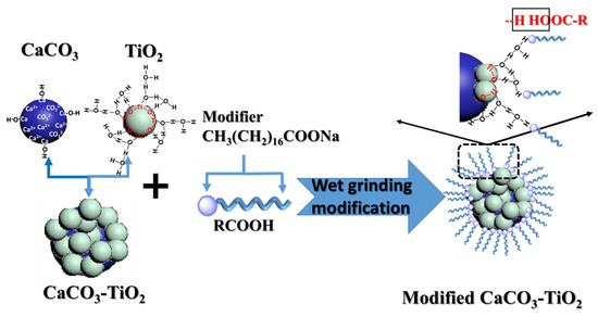 - The modifier was chemisorbed on the surface of particles. The binding of the modifier with CaCO3-TiO2 was mainly induced by the dehydroxylation of RCOOH and hydroxyl groups on the TiO2 surface.