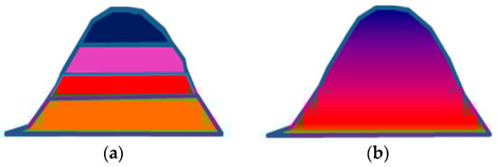 A geologic model of the constraints and borders of the mineralization zones must be constructed prior to estimating a spatial variable in a mineral resource using geostatistics [7]. In many applications, domain boundaries are often referred to as either “hard” or “soft” [8]. Figure 1 shows a very simplified schematic figure of the differences between soft and hard boundaries. Boundaries are termed “hard” when an abrupt change in average grade or variability occurs at the point of contact between two geologic domains, as in the case of coal seams or sedimentary zinc deposits. In disseminated mineralization, as seen in some porphyry Cu-Au or massive iron deposits, the type of boundary contact is gradational, i.e., the grades change transitionally across a boundary, in which case the contact is referred to as having a transitional (soft) boundary [8].