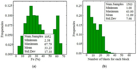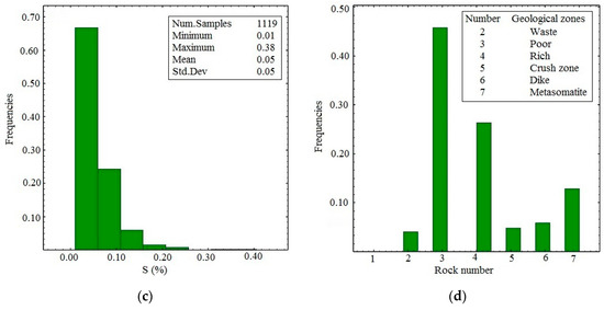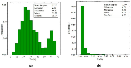 Borehole samples were obtained from 42 vertical boreholes at an average drill hole spacing of 50 m. Borehole data included the concentrations of Iron (Fe (%), Figure 3a), Phosphorous (P (%), Figure 3b), and Sulfur (S (%), Figure 3c). Being naturally low as required for the particular mine’s processing plant, P (%) and S (%) distributions were not considered (Table 1). The target of this work is the best precision possible for Fe (%) grade estimation, by using and comparing different methods. The grade data and geologic information of boreholes were available (Table 2). The geologic information consisted of visual recordings by geologists and petrophysical classifications of drill cores (Figure 3d). As the samples had different lengths, they were regularized to 2.0 m [32].