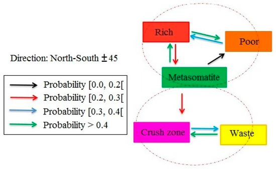 Since the aim of the study was to detect preferential contacts, i.e., only positive preferentiality values, and identify dominant behaviors, the results given in Table A1 are classified into four classes and schemes for each direction. Figure 11 of the paper gives data for the North–South direction. An arrow represents a spatial transition, while the color indicates the magnitude of the transition. The preferential schemes obtained from Table A1, are not connected to the location of geological domains in space. Therefore, the only rule that should be respected is about the arrows and their colors, then the place and colors of domains can be changed.