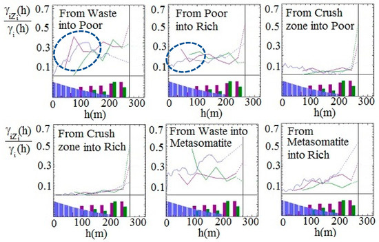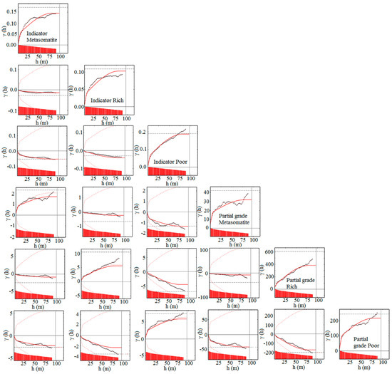 The variogram ratios derive from the probabilistic interpretation of the direct and cross indicator variograms and their ratios [22], as shown in Appendix A. The variogram ratios enable identification of average grade increase or decrease when moving from one geologic domain into another. This variation is called “border effect” and is the prerequisite for the PG method. The tools mentioned above can be used to differentiate the transitional and hard boundaries in geologic domains.