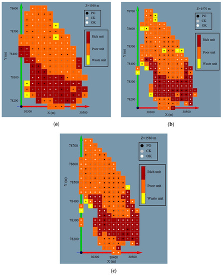 Maps of real block values obtained from mean of blastholes with optimum estimation method (e.g., three exploited levels). (a) is the horizontal section z = 1560 m, (b) is the horizontal section z = 1570 and (c) is the horizontal section z = 1580 m.