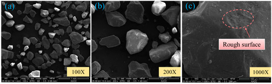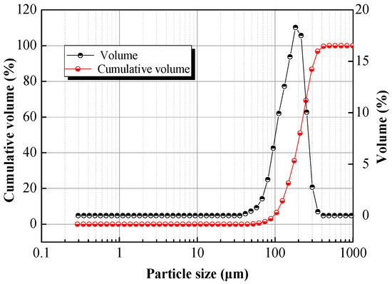 AS was obtained from the local mining area in Yulin in Northwest China, where it is cheap to buy and distributed naturally, widely, and in massive amounts. Figure 1 shows the microstructures observed through scanning electron microscopy (SEM). It was found that there were abundant small voids among the particles. The particles were not angular with irregular or rough surfaces and they did not contain cracks or pores. Figure 2 shows the distribution of grain sizes. The AS particles were fine and hard with a main grain size of 100–300 μm and a minimum particle size of 50 µm, thereby allowing good pressure transfer. The coefficient of uniformity and coefficient of curvature of the AS were 1.8–2.0 and 0.9–1.1, respectively.
