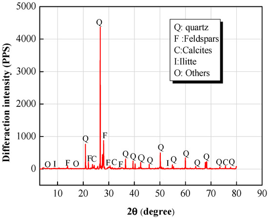 The chemical composition of the AS sample was tested with a D8 ADVANCE X-ray diffraction (XRD) instrument (Bruker, Karlsruhe, Germany), as shown in Figure 3 and Table 1. The AS was shown to contain a considerable amount of quartz and feldspars, as well as some calcites and illite. SiO2 and Al2O3 were the main oxides within the AS (67.49% and 8.75% by weight, respectively).