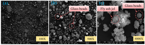 FA was obtained from a coal-fired power plant near the mining area in Yulin. FA is gray/black in color and is similar to cement in appearance. Figure 4 shows the microstructures obtained through SEM, and Figure 5 shows the distribution of particles. The range of the main grain size of the FA was 10–100 μm, and the minimum particle size was 3.5 µm, with 65 ± 5% of the FA having grain sizes less than 50 μm. When the FA was piled up, it was in a powdered form with a fluffy interior and had high plasticity. The FA particles were found to be irregular chips and cohesive objects under SEM observation. Under a greater SEM magnification, many glass beads with smooth and compact surfaces and grain sizes 1–10 μm were observed to be independent from or gathered together with other glass beads. The chemical composition of the FA sample is shown in Table 1; the main oxides of FA are SiO2 and Al2O3, with percentages by weight of 41.29% and 26.69%, respectively. Those compositions play an important role in determining strength [20].