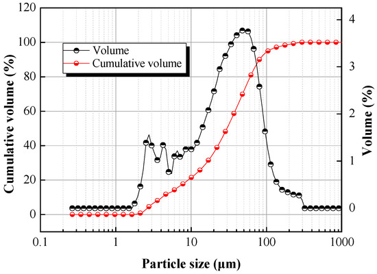 The cementing material used in the present experiments was grade 42.5 ordinary Portland cement, which had fine particles with main grain sizes in the range 30–60 μm and a minimum particle size of 1.7 μm. Figure 6 shows the distribution of particles. The grain sizes of 80 ± 5% of the cement particles were less than 60 μm, and approximately 50% of the cement particles had grain sizes of less than 30 μm.