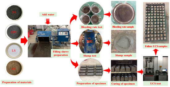 After mixing the AS, FA, cement, and LS in certain proportions (wt. %), water was added to the mixture, which was subsequently stirred with a mechanical mixer into a fluidized slurry of cemented filling material. Part of the slurry was used to test the bleeding rate and slump according to the GB/T50080-2016 Chinese national standard for test method of performance on ordinary fresh concrete (China Academy of Building Research). The remaining slurry was used to make a specimen in a cubic steel mold with dimensions of 70.7 mm × 70.7 mm × 70.7 mm. This mold was removed after 8 h. The specimens were then cured under standard curing conditions at room temperature of 20 ± 2 °C and a humidity of 95% for curing times of 1, 3, 7, 14, and 28 days. The mechanical properties of a filled object were tested for each curing time according to the GB/T23561.12-2010 methods for determining the physical and mechanical properties. Table 2 lists the scheme of the proportioning tests and Figure 7 shows the process of cemented filling material preparation and test.