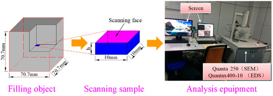 The microstructure of the filling material has an important influence on its strength. In this paper, a Quanta 250 scanning electron microscope (FEI, Hillsboro, Oregon state, USA) and a QUANTAX 400-10 energy-dispersive spectrometer (Bruker, Karlsruhe, Germany) were used to observe the microstructure and element distribution characteristics in the filled object. The observation sample is required to cut a rectangular parallelepiped with a bottom area of 10 mm × 10 mm and a height of 3–5 mm from the inside of the filling object. This was dried with a drying oven at a temperature of 60 °C for 24 h. The SEM and EDS scanning sample preparation process and analysis equipment are shown in Figure 8.