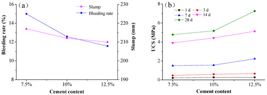 Figure 10a shows that increasing the cement content caused the bleeding rate and slump of the filling material slurry to decrease gradually. When the cement content was 12.5%, the bleeding rate reached its minimum of 11.57% and the slump remained good (210 mm). According to the results from a laser particle analyzer, the main grain size of the cement used in the testing ranged from 30 to 60 μm. The cement particles wrapped up free water after making contact with water and then formed bound water. A higher cement content resulted in more free water being consumed [26], thereby increasing the viscosity of the slurry while decreasing its bleeding rate and slump.