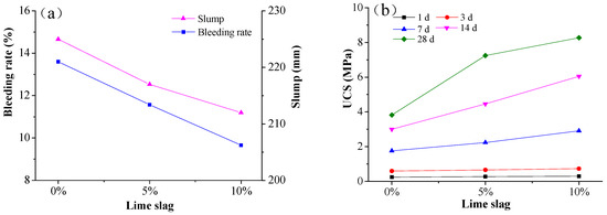 Figure 11a shows that, as the LS was added, the bleeding rate and the slump of the filling material slurry both decreased, the effects of which became larger as the LS content increased. When 5% and 10% of LS were added, the bleeding rate decreased by 2.03% and 3.96%, respectively, while the slump decreased by 8 mm and 13 mm, respectively. This is because the water absorption capacity of the CaO contained in the LS reduced the free water content in the filling material slurry, causing the bleeding rate and the slump of the filling material slurry to decrease gradually.