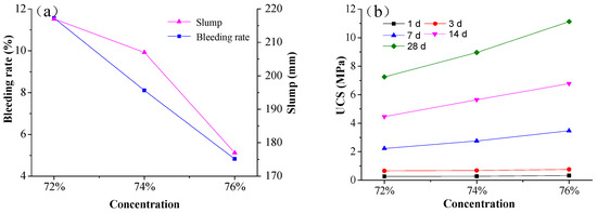 Figure 12a shows that with an increase in the concentration, the bleeding rate and slump of the filling-material slurry decreased significantly. When the concentration was 76%, the bleeding rate reached a minimum of 4.83%, which was smaller than the bleeding rate by 58.3% and 40.4% when the concentration was 72% and 74%, respectively. The slump decreased from 217 mm to 177 mm when the concentration increased from 72% to 76%. The subsidence process of large particles inside the filling material slurry was resisted by surface shear stress and suspended micro particles. When there was less water, the sinking resistance of the particles was larger; thus, the subsidence was slower and the bleeding rate was smaller [32,33]. Materials with the same proportion of solid particles had the same ability to absorb water. A material slurry with a larger concentration contained less free water, indicating that when the concentration was larger, the bleeding rate and slump were smaller.