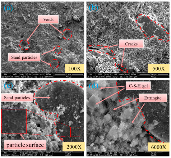 SEM micrographs of microstructure inside filled object for a curing time of 7 days under various magnifications (as indicated in the bottom right-hand corners): (a) filled object at 100× magnification; (b) filled object at 500× magnification; (c) filled object at 2000× magnification; (d) filled object at 6000× magnification.