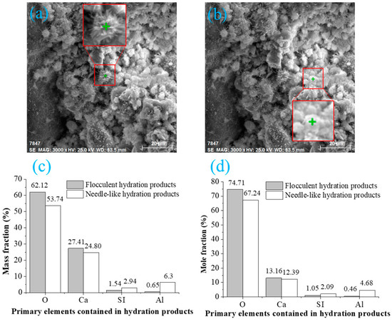 Figure 15a,b show the locations of the selected EDS testing spots for the hydration products for a curing time of 7 days, while Figure 15c,d show the testing results for elements at the selected testing spots. Given that O, Ca, Si, and Al were the four primary elements in the hydration products, the above elements were selected as the analysis objects. The testing results show that O and Ca had the highest contents in the hydration products. The contents of O and Ca in the flocculent hydration products exceeded those in the needle-like hydration products, whereas the contents of Si and Al were lower. The flocculent hydration products contained only 0.65 wt. % Al, whereas the needle-like hydration products contained 6.3 wt. % Al. According to the mechanism underlying the hydration reaction of cement [35,36], it could also be determined that the flocculent hydration product containing only a small amount of Al was C-S-H, and the needle-like hydration product was AFt.