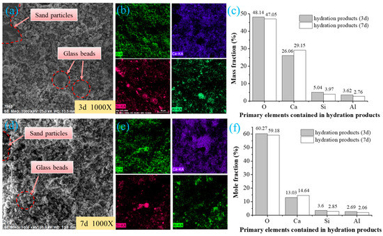 Figure 16a,d show the locations and testing results for selected surfaces during EDS surface element testing of hydration products for curing times of 3 and 7 days. According to the element distributions in the testing surfaces in the filled objects with the two curing times, as shown in Figure 16b,e, the element distributions were related to the compositions inside the filled objects. Elements O, Ca, Si, and Al were distributed intensively in the region in which the hydration products were concentrated. The Si content was larger in areas where there were sand particles and there was relatively more Al, O, and Si inside the glass beads, due to the presence of Al2O3 and SiO2. Analyzing Figure 16c,f allowed us to determine that the Ca content inside the filled objects increased moderately with an increase in the curing time, while the Al content decreased moderately. This indicates that during the hydration reaction, the C-S-H content increased gradually, the AFt content decreased gradually, and the generation and transformation of hydration products in local regions influenced the transmission and redistribution of elements inside the filled objects.