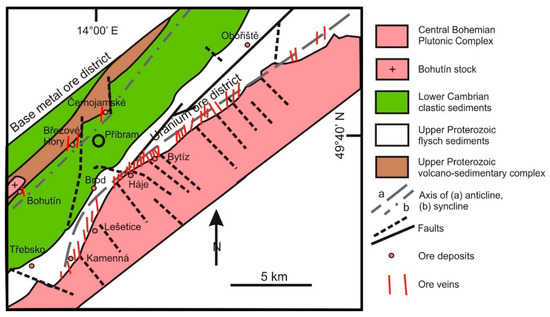 Schematic geological map of the Příbram base metal and uranium ore districts (modified from Kříbek et al. [17]).