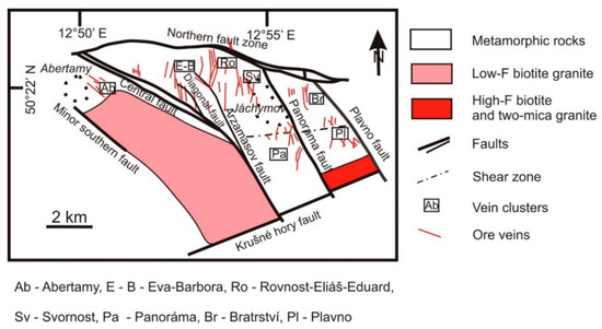 The Jáchymov uranium district covers approximately 45 km2 of the central area of a NE–SW trending antiformal structure of the Krušné Hory/Erzgebirge Mts. This unit belongs to the Saxothuringian Zone, which is the most complex part of the central European Variscides [23]. This ore district is located at the intersection of two regional fault zones, the NW–SE striking Gera-Jáchymov fault zone and the ENE–WSW striking Krušné Hory fault zone (Figure 3) [24]. The host rocks of the Jáchymov ore district are Neoproterozoic and Cambrian metamorphic rocks of the Jáchymov series, overlying the granitic rocks of the Eibenstock-Nejdek pluton. Two vein groups could be distinguished in the Jáchymov uranium district: the ore-rich N–S veins and weakly mineralized or barren E–W veins.