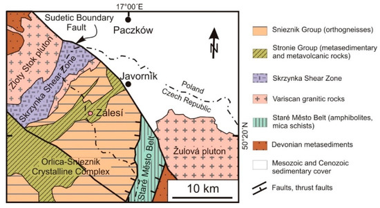 The Zálesí uranium deposit is located on the north-eastern margin of the Bohemian Massif (Figure 1), within the Orlica-Śnieżnik crystalline complex (OSCC), an Early Palaeozoic magmatic–sedimentary sequence that was metamorphosed during the Variscan orogeny [30,31,32]. The OSCC is formed by metamorphic rocks of the Stronie and Śnieżnik Groups (Figure 5). The ore deposit occurs within a pocket of metamorphic rocks of the Stronie Group, which is tectonically thrust between Śnieżnik orthogneisses [32]. The rocks of the Stronie Group host all of the economic mineralization, which consists of 30 individual veins and two stockwork bodies, and mineralization was located mainly in the N–S striking complex quartz-carbonate veins up to 25 cm thick [33]. One-third of the mined ore originated from two stockwork bodies, situated within the “Central Tectonized Zone”, and was composed of a dense net of subparallel veinlets. Three mineralization stages were distinguished—uraninite, arsenide and sulphide [34]. Primary uraninite was partly replaced by a coffinite-like mineral. Chemical dating by electron microprobe gave ages of 232–135 Ma (median 161 Ma), and 95–15 Ma (median 43 Ma) for uraninite and “coffinite”, respectively [34]. The uranium ores of the Zálesí deposit were mined from 1959 to 1968 yielding 405.3 t U from ore containing 0.105 wt % U [2].