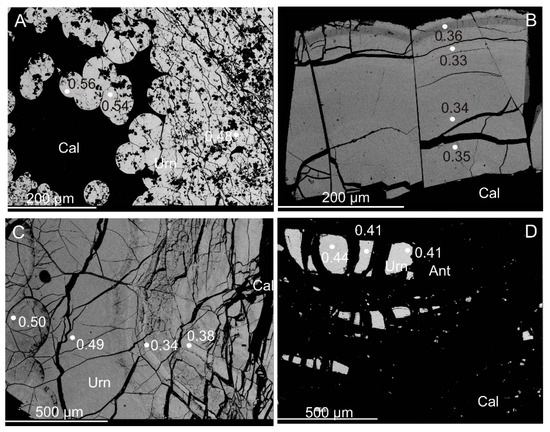 Back-scattered electron (BSE) images of uranium mineralization with distribution of Ca (apfu, O = 4) in uraninite, Příbram uranium district. (A) Botryoidally evolved aggregates of uraninite; (B) Detailed distribution of Ca in botryoidally evolved uraninite; (C) Detailed distribution of Ca in partly zoned uraninite; (D) Distribution f Ca in uraninite included in anthraxolite. Urn—uraninite, Cal—calcite, Ant—anthraxolite.