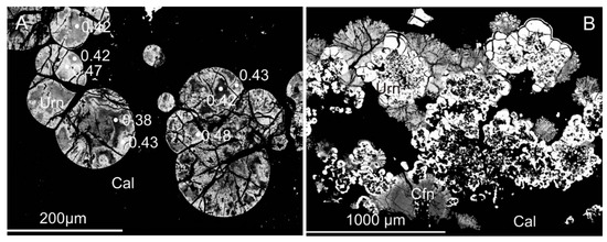BSE images of uranium mineralization with distribution of Ca (apfu, O = 4) in uraninite, Zálesí uranium deposit. (A) Distribution of Ca in botryoidally evolved uraninite; (B) Intergrowths of uraninite with coffinite. Urn—uraninite, Cfn—coffinite, Cal—calcite.