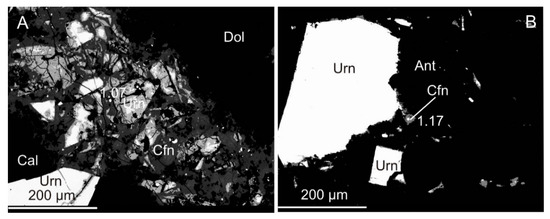 BSE images of uranium mineralization with distribution of Si (apfu, O = 4) in coffinite, Příbram uranium district. (A) Distribution of Si in coffinite enclosed in calcite; (B) Distribution of Si in coffinite that is enclosed in antraxolite. Urn—uraninite, Cfn—coffinite, Ant—anthraxolite, Cal—calcite, Dol—dolomite.