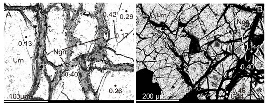 BSE images of uranium mineralization with distribution of Ca (apfu, O = 4) in ningyoite and uraninite, Potůčky uranium deposit. (A) Distribution of Ca in ningyoite and uraninite, (B) Detailed BSE image of distribution of Ca in ningyoite. Urn—uraninite, Ngn—ningyoite.