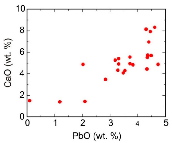 A substitution of the type 2U4+ = (U6+ + Ca2+) has been proposed in oxidised Ca-rich uraninite [7]. Concentrations of Ca in the uraninites analyzed varied from 0.7 wt % to 8.3 wt % CaO. The highest Ca content in uraninite from the Horní Slavkov uranium district (up to 8.3 wt % CaO) together with a positive correlation between CaO and PbO (correlation coefficient 0.72; Table 4), suggests significant oxidation of uraninite (Figure 13). A similar relationship between Ca and Pb was also observed at the Zálesí deposit (correlation coefficient 0.74; Table 4), but at other sites no statistically significant correlations between both elements were found (correlation coefficients ≤0.41; Table 4). The concentrations of Ca in other vein-type uranium deposits (Great Bear Lake and Algoma, Canada, Armorican Massif and Massif Central, France) ranged from 1.3 wt % to 9.5 wt % CaO [42,43,44,45].