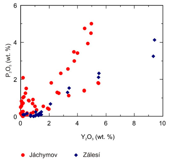 Some coffinites from the vein-type uranium deposits studied were enriched in Y. In all cases, these uranium deposits contained superimposed five-element (Ag–Bi–As–Co–Ni) mineralization. The highest Y concentrations were found in coffinites from the Jáchymov uranium district (up to 5.5 wt % Y2O3) and the Zálesí deposit (up to 9.4 wt % Y2O3) (Figure 14). In both cases there was a positive correlation between Y and P (correlation coefficients 0.69 and 0.75, respectively; Table 5), and therefore the following substitution mechanisms could have been involved: