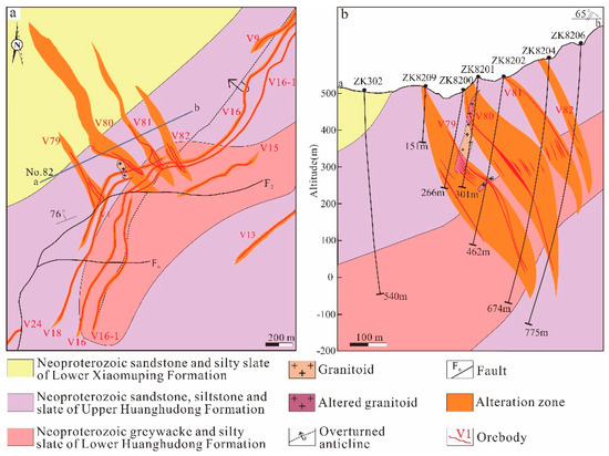 (a) Simplified geological map of Zhengchong gold deposit showing the major host rocks, orebodies and alteration zones; (b) Profile of the No. 82 cross section of the Zhengchong gold deposit.