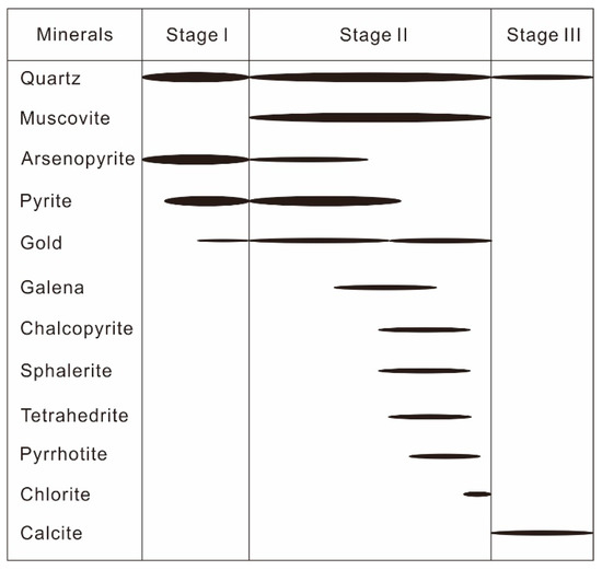 Ore minerals are mainly composed of native gold, arsenopyrite and pyrite with minor galena, sphalerite, chalcopyrite, tetrahedrite and pyrrhotite. Based on detailed field mapping and observation under microscope, three mineralization stages were recognized at the Zhengchong deposit (Figure 4): (i) Quartz–auriferous arsenopyrite–pyrite; (ii) Quartz–polymetallic sulfides–native gold–minor chlorite; and (iii) Barren quartz–calcite vein. Compared with a previous description [26], early quartz vein is barren including no sulfides. The gold content of ore-bearing quartz vein is more than 10 g/t. We observed both invisible gold evenly dispersed in arsenopyrite and pyrite in this type of deposit in NEHP [10,35,36], and native gold in fractures and curved dissolution edges of arsenopyrite and pyrite.
