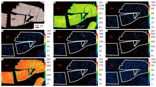 The major and trace elements are not conformably distributed in the arsenopyrite deformed as shown in the elements map (Figure 6). Sulfur is a major element of the arsenopyrite with slightly higher content in the internal zone (Figure 6b), but this trending of value difference of other major and trace elements has not been observed. Cobalt, nickel, antimony and gold contents are uniformly distributed in the arsenopyrite with low values (Figure 6c,d,h,i). Similarly, copper and zinc also have uniform distribution in the arsenopyrite, but the contents of both elements are slightly high in the fractures and cracks (Figure 6e,f). Arsenic, a major element with high content, is homogeneously distributed in this kind of arsenopyrite (Figure 6g).