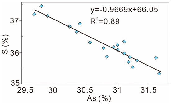 Arsenic is the principal element in reflecting the forming temperature of different generations of arsenopyrite [37]. Twenty pieces of data of the core of ore-bearing arsenopyrite from the Zhengchong gold deposit yielded arsenic atomic percentages of 29.71%–31.66%, showing wide systematic variation within the same generation (Table 1). The yielded sulfur atomic percentages were 35.35%–37.44%. Moreover, the sulfur content has a negative correlation with arsenic values, with a regression coefficient of −0.97 and R2 of 0.89 (Figure 7).