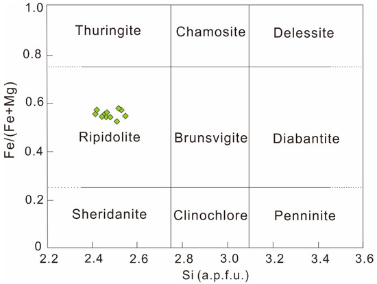 Chlorite is widely distributed in the pressure shadows around rigid arsenopyrite and pyrite in ores at the Zhengchong deposit. Chlorite samples from different sites of the pressure shadows have similar compositions, such as SiO2 (21.51–23.16 wt %), MgO (11.56–13.26 wt %), FeO (25.90–28.37 wt %) and Al2O3 (21.84–23.13 wt %) (Table 2). The contents of Cr2O3, CaO, K2O and Na2O are low. The total values of the Fe/(Fe + Mg) ratios range from 0.52 to 0.58. Owing to the extremely small amount of MnO in the chlorite, Fe/(Fe + Mg + Mn) is approximately equal to Fe/(Fe + Mg). Silicon values vary from 2.43 to 2.55 a.p.f.u. Hence, the chlorites in the pressure shadows were defined as ripidolite type (Figure 8), a kind of chlorite with relatively high Fe irons according to the classification of chlorites [38].