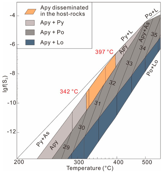 As shown above, arsenopyrites formed earlier than the polymetallic sulfides in the fractures or pressure shadows of arsenopyrite and pyrite (Figure 5a,b,d). Thus, the sulfide associated with arsenopyrites is only pyrite (Figure 4). Hence, the arsenic values from both internal and external zones of arsenopyrite fall in the “pyrite + arsenopyrite” zone of the buffered assemblages involving arsenopyrite in the Fe-S-As system [14,39]. The temperatures and lgf(S2) of arsenopyrite are almost successive due to their similar arsenic contents (Figure 7). The temperature is constrained from 322 °C to 397 °C, and the yielded lgf(S2) of the disseminated arsenopyrites is from −10.5 to −6.7 (Figure 9).