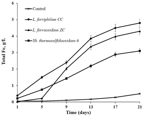 Bioleaching of pyrite from Shamlugh ore (Armenia) was studied with L. ferriphilum CC, Sb. thermosulfidooxidans 6, L. ferrooxidans ZC. The concentrations of leached iron over time are shown in Figure 1. The amount of total iron extracted from pyrite by L. ferriphilum CC was higher than that of L. ferrooxidans ZC or Sb. thermosulfidooxidans 6.