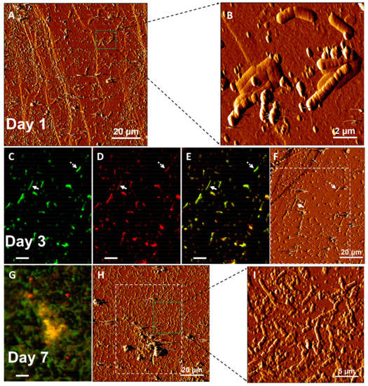 Surface colonization and partial biofilm formation by cells of At. ferrooxidans 61 on a pyrite coupon after 1 day (A,B), 3 days (C–F) and 7 days (G–I) of incubation at 30 °C and shaking at 130 rpm in the dark. AFM images (A,B,F,H,I), EFM images (C–E,G). EFM images: (C) biofilm cells stained by Syto®9 (Green). (D) biofilm cells stained with Tetramethylrhodamine (TRITC)-Con A (Red). (E,G) combination of Syto®9 and TRITC-Con A. The framed area in (F) corresponds to the same area in (C–E) observed by EFM. The framed area in (H) corresponds to the same area in (G) observed by EFM. The framed areas by green lines in (A) and (H) are zoomed in (B) and (I) respectively. Bars in (C–E,G) represent 10 µm. Dashed and solid arrows in (C–F) point at the same bacterium, respectively.