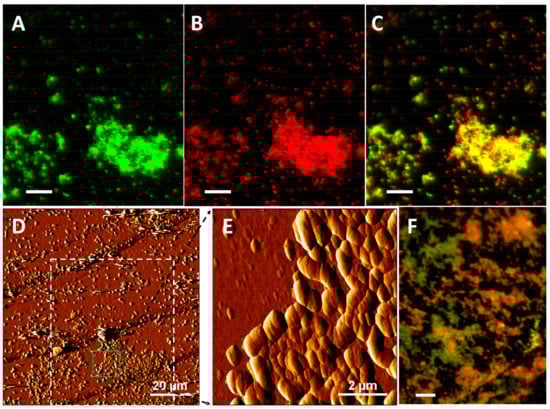 Surface colonization and partial biofilm formation by L. ferrooxidans ZC on a pyrite coupon after 3 days (A–E) and 7 days (F) of incubation at 30 °C and shaking at 130 rpm in the dark. AFM images (D,E), EFM images (A–C,F). EFM images: (A) biofilm cells stained by Syto®9 (Green). (B) biofilm cells stained by TRITC-Con A (Red). (C,F) combination of Syto®9 and TRITC-Con A. The framed area in (D) corresponds to the same area in (A–C) observed by EFM. The framed area in (D) is zoomed in (E). Typical morphology of spiral is shown in (E). Bars in (A–C,F) represent 10 µm.