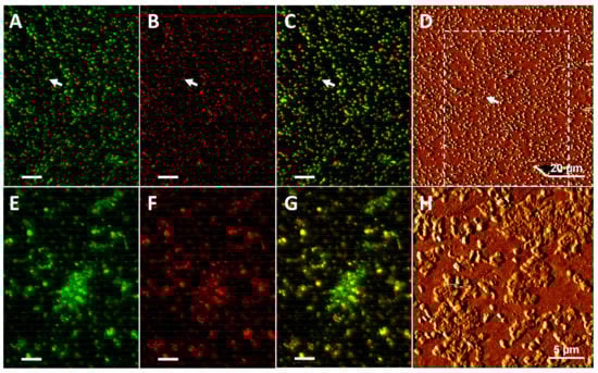 Surface colonization and partial biofilm formation by Sb. thermosulfidooxidans 6 on a pyrite coupon after 3 days (A–D) and 7 days (E–H) of incubation at 30 °C and shaking at 130 rpm in the dark. AFM images (D,H), EFM images (A–C,E–G). EFM images: (A,E) biofilm cells stained by Syto®9 (Green). (B,F), biofilm cells stained by TRITC-Con A (Red). (C,G) combination of Syto®9 and TRITC-Con A. The framed area in (D) corresponds to the same area in (A–C) observed by EFM. Bars in (A–C,E–G) represent 10 µm. Solid arrows in (A–D) point at the same bacterium.