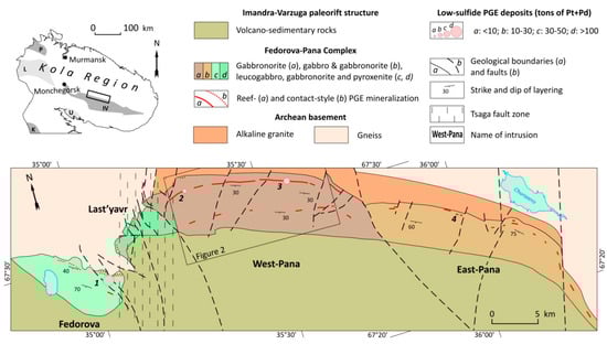 Figure 1. Simplified geological map of the Fedorova-Pana Complex, showing the location of low-sulfide PGE deposits (1, Fedorova Tundra; 2, North Kamennik; 3, Kievey; 4, East Chuarvy). Modified after [12]. Proterozoic structures of the predominantly Archean Kola Region (inset): Imandra-Varzuga (IV), Kuolajarvi (K), and Pechenga (P) paleorift structures; Lapland (L) and Umba (U) granulite belts.