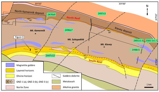 Figure 2. Simplified geological map of the West-Pana intrusion. Published U-Pb ages are shown in green rectangles. Note that the intrusion was explored for PGE mainly along strike of the North and South Reefs, but sub-economic to economic deposits were only discovered in the former. Abbreviations: GNZ, Gabbronorite Zone. Modified after [3].