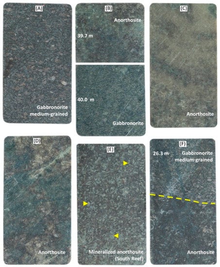 Figure 4. Different rock types from the Main Anorthosite Layer and its host rocks (Borehole 30). (A) Medium-grained gabbronorite from the footwall of the Main Anorthosite Layer (depth: 42.15–42.30 m). (B) Thirty centimeter-thick gradational lower contact of the Main Anorthosite Layer (depth: 39.7–40.0 m). (C) Monomineralic anorthosite (depth: 33.20–33.35 m). (D) Mottled anorthosite (depth: 29.45–29.6 m). (E) Mineralized anorthosite from the “South Reef”. The sample contains 2 ppm Au, 3 ppm Pt, and 33 ppm Pd, respectively. Note the replacement of interstitial minerals by secondary epidote and sulfides (depth: 27.75–27.90 m). (F) Sharp upper contact (dashed line) between anorthosite and the overlying medium-grained gabbronorite (depth: 26.30–26.45 m).