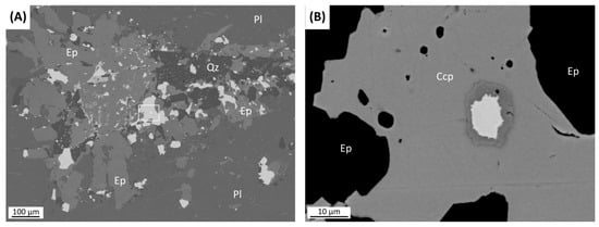 These “South Reef” anorthosites are coarse-grained cumulate rocks with a mottled texture, containing some 75–98 vol. % plagioclase, intercumulus quartz, ortho-, and clino-pyroxene, as well as secondary amphibole, biotite, epidote with minor amounts of chalcopyrite, bornite, millerite, pentlandite, pyrrhotite, magnetite, and ilmenite. Accessory minerals include zircon, baddeleyite, apatite, titanite, and rutile. More than three tens PGE and Au minerals occur in the mineralized anorthosite [11,27]. The mottled texture of the anorthosite is defined by the local concentration of plagioclase crystals in distinct areas (Figure 4C), whereas other parts are strongly affected by autometamorphic processes, leading to the complete replacement of the initial intercumulus mineral assemblages by secondary amphibole and epidote (Figure 4D). The mineralized anorthosite contains 2–5 vol. % disseminated sulfide (Figure 4E), mostly hosted by secondary epidote interstitial to cumulus plagioclase (Figure 5A).