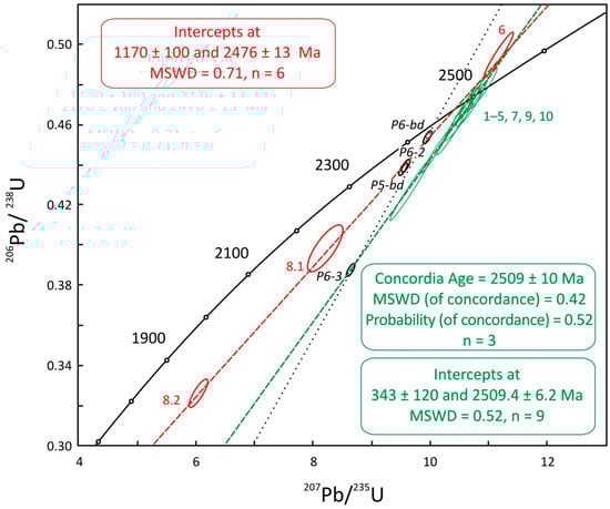 The first group of zircons (eight grains: 1–5, 7, 9, 10) comprises fragments of large columnar crystals, showing a weak zonation in CL images. Most of these zircons have a low discordance (Table 1).Three of them (7, 9, 10) have a discordance close to zeroand plot on the concordia with a calculated age of 2509 ± 10 Ma (including decay constant errors; MSWD = 0.42; concordance probability is 0.52). Three relatively discordant zircon grains of this group (1, 2, 5) together with concordant zircons form a discordia, which includes the ID-TIMS multi-grain zircon analysis P6-3 (Figure 7). This data point was taken from a previous study and represents a zircon from the same lithology [13]. The upper intercept age of the resulting composite discordia (n = 9) is 2509.4 ± 6.2 Ma (MSWD = 0.52), whereas the lower intercept corresponds to an age of 343 ± 120 Ma.