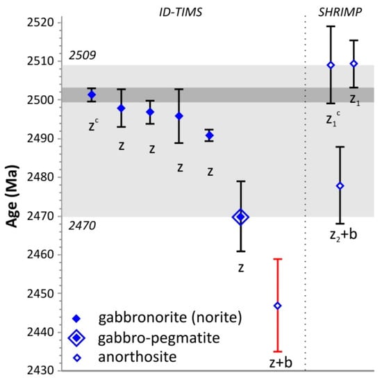 The existing U-Pb age of 2447 ± 12 Ma for the Main Anorthosite Layer (Table 2) was determined by multi-grain ID-TIMS on zircon and baddeleyite [13]. Since baddeleyite generally crystallizes as a late-stage mineral in layered intrusions [36], this age was considered to indicate the crystallization age of the anorthosite. Therefore, the Main Anorthosite Layer was interpreted to represent an additional sill-like intrusion that was emplaced some 50 Ma after the crystallization of the West-Pana intrusion [13,37].
