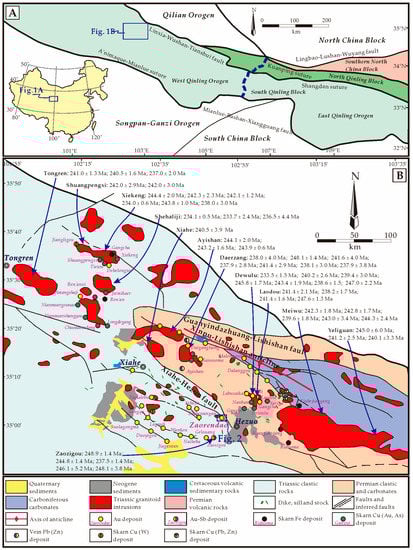(A) Major tectonic domains of China and the location of the Qinling Orogenic Belt. Inset shows the location of the study area (modified after [12]). (B) Simplified geological map of the Tongren-Xiahe-Hezuo district of the West Qinling orogen, showing distributions and ages of Early Triassic granitoids and ore deposits (modified after [12] and [21]).